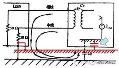 分析:上圖是樣品不帶地線時(shí),傳導(dǎo)測(cè)試的簡化原理,EUT產(chǎn)生的工模騷擾,經(jīng)過50歐姆阻抗,然后通過實(shí)驗(yàn)室接地銅板和EUT共模騷擾地之間形成的耦合電容CP,形成騷擾回路,接收機(jī)測(cè)試到的信號(hào)就是50歐姆阻抗上的壓降。那么,接入地線以后,以上的測(cè)試過程有哪些變化呢?請(qǐng)看下圖: